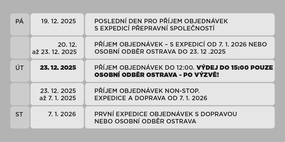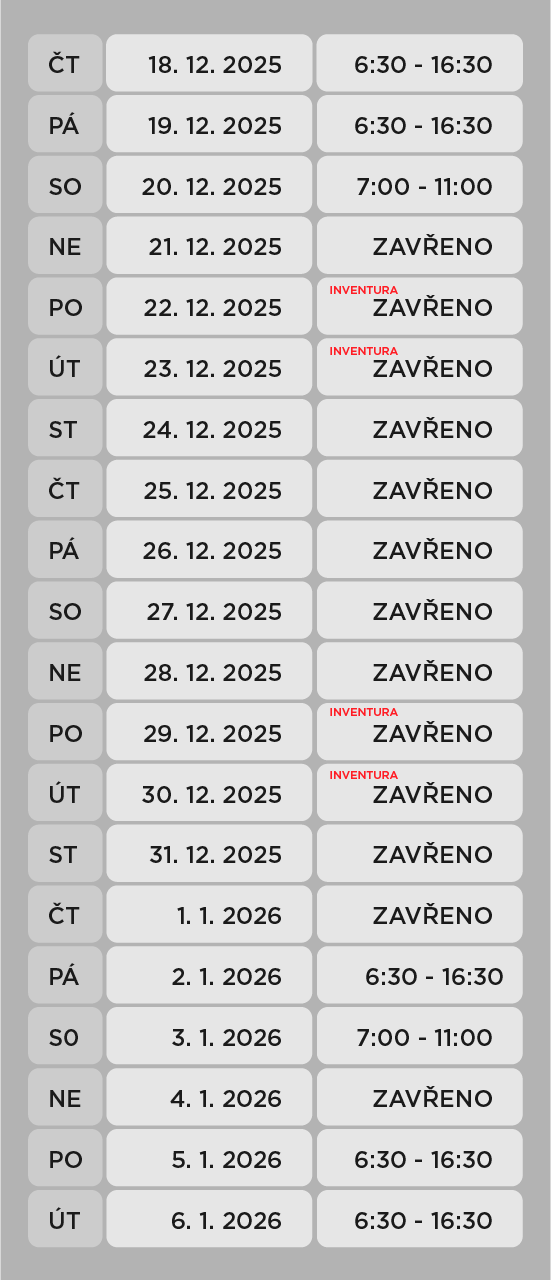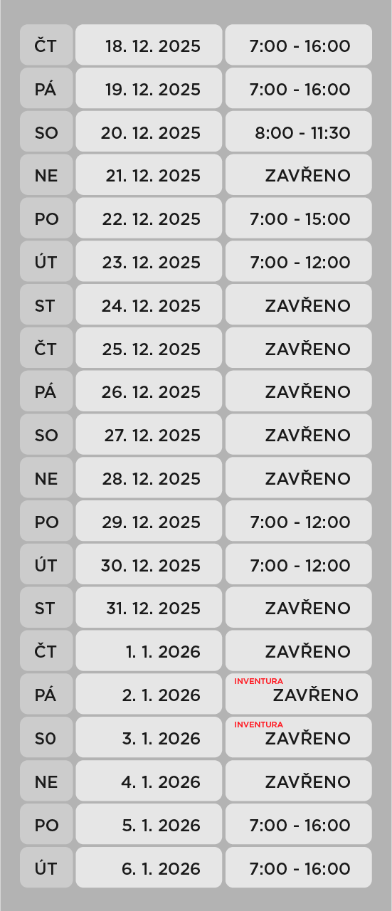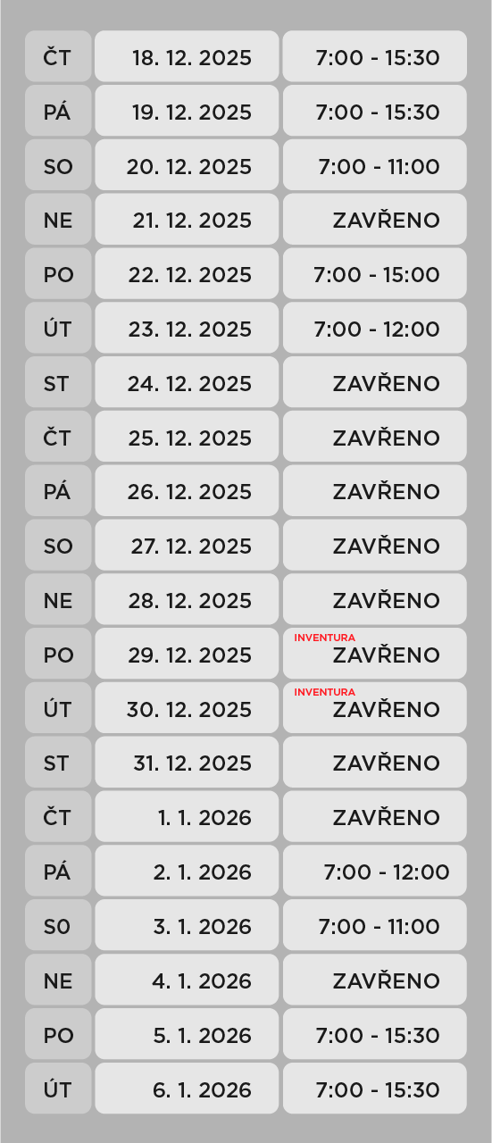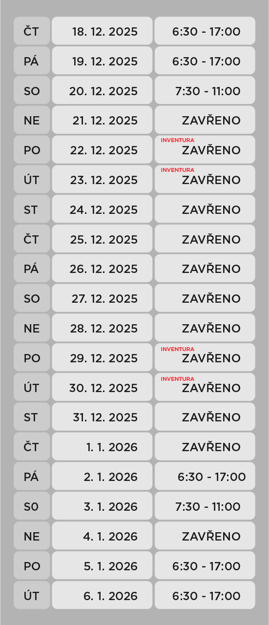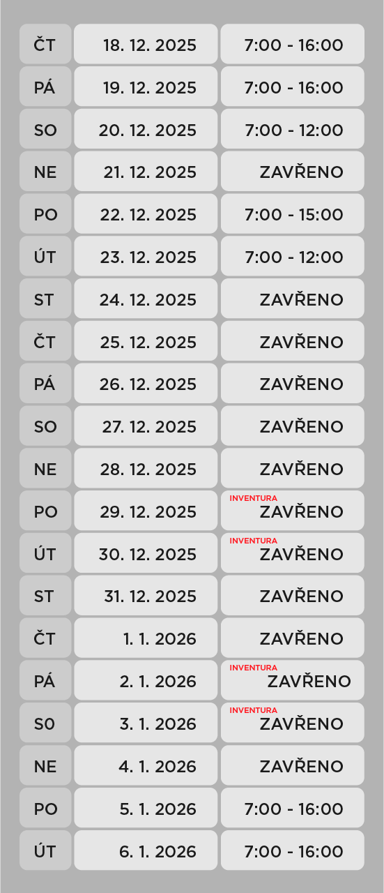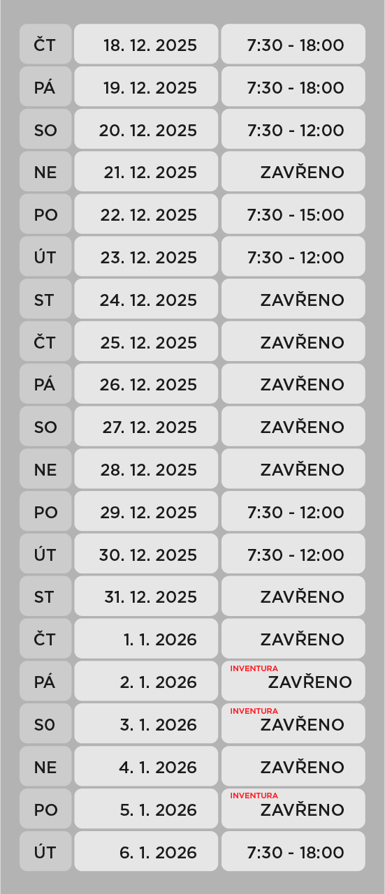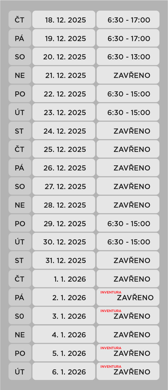 Zpět na přehled článků Otevírací doba prodejen o svátcích na přelomu roku 2025/2026 Ostrava Kobeřice Krnov Bruntál E-shop Dolní Benešov - Zábřeh Opava Vrbno p. Pradědem Hlučín Zpět na přehled článků