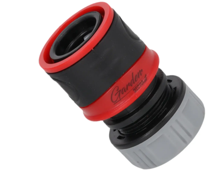 S rychlospojkou pro zahradní hadice DEDRA 80N112 můžeme rychle ap ev ně připojit 1/2" zahradní hadici k zavlažovacímu systému bez použití nářadí nebo hadicových svorek. Utažením knoflíku se dosáhne bezpečného a pevného spojení bez nutnosti použití svorek nebo stahovacích pásků. Rychlospojka je vyrobena z odolného plastu ABS a PP, který zajišťuje dlouhou životnost. Rychlospojka je navíc obložena měkkým materiálem T PR, který zvyšuje pohodlí a přilnavost, a to i za mokra. Vnitřní ventil přeruší přívod vody při odpojení připojenéhoprvku, např.pistole nebo postřikovače.