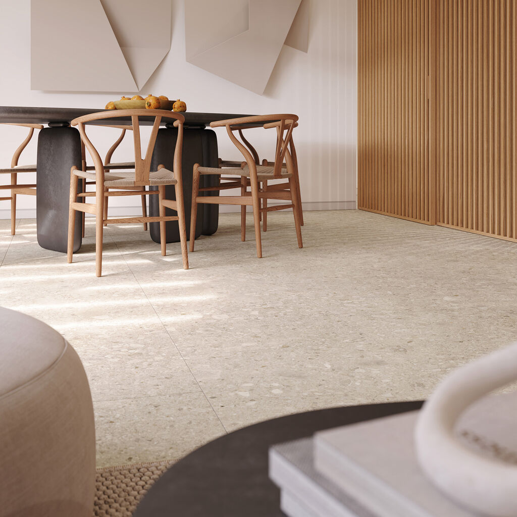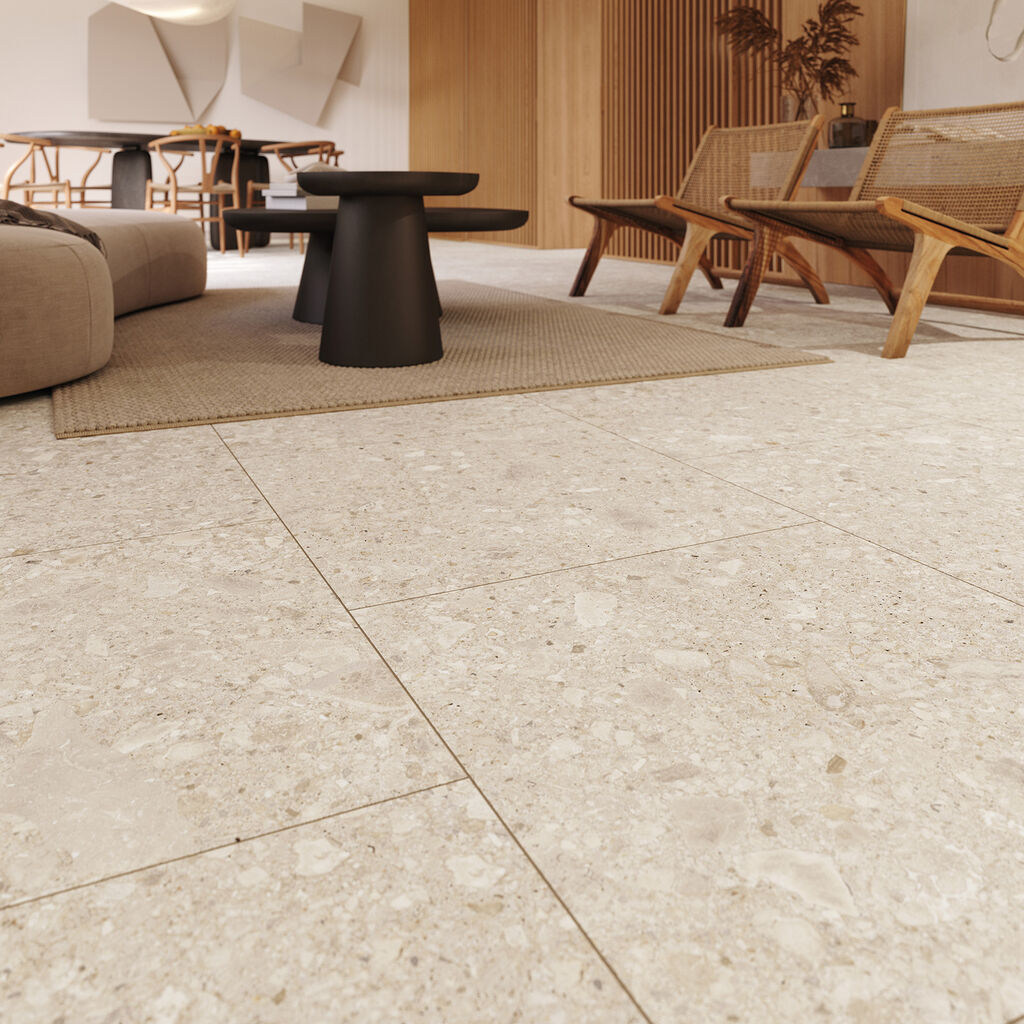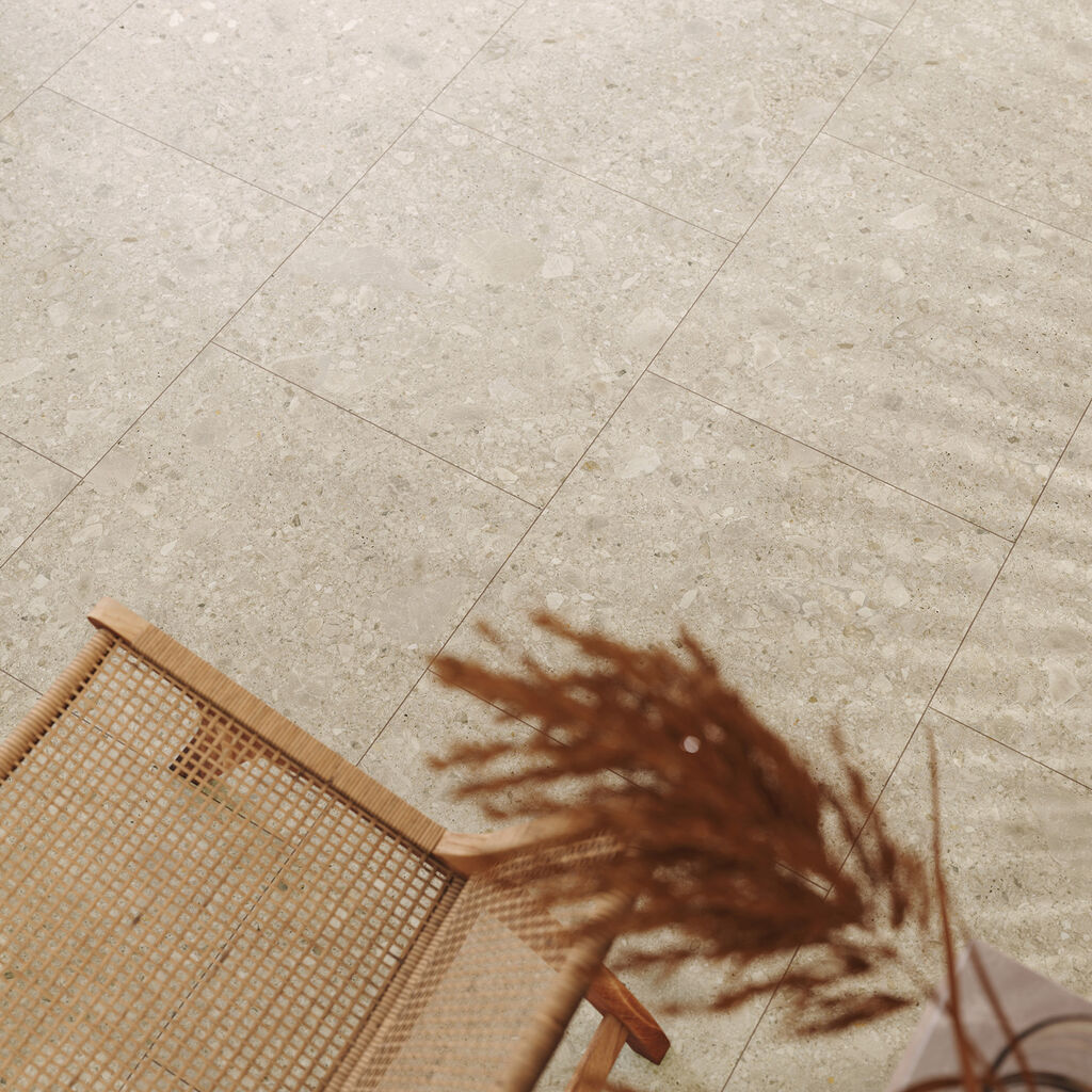 Díky jemnému béžovému odstínu (označovaném jako Malt) a nepravidelné struktuře s drobnými oblázky vytváří dlažba autentický a živý povrch, který prosvětlí koupelnu, kuchyni i obývací prostory.