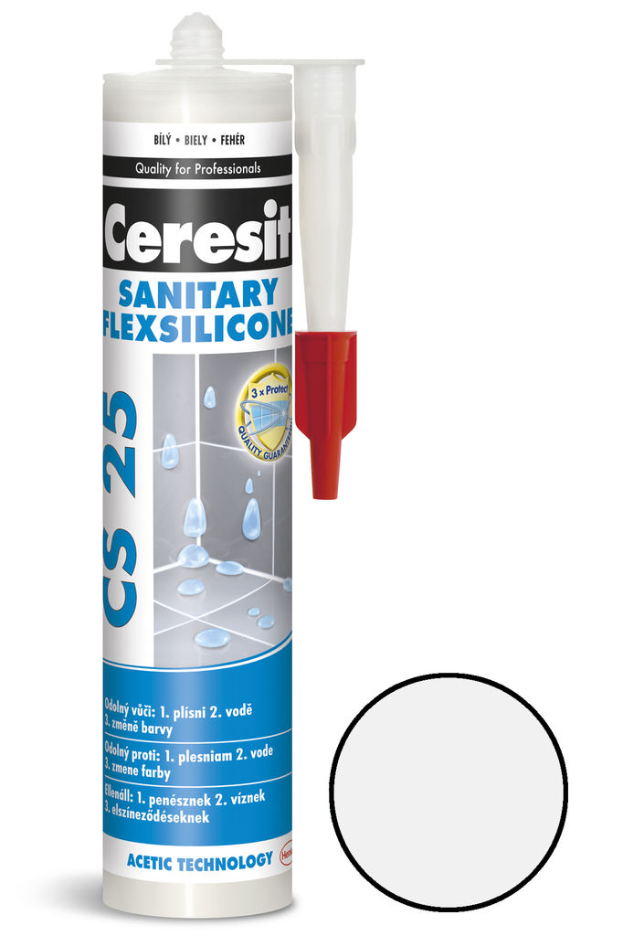 Sanitární silikon Ceresit CS 25 SANITARY je určen pro vyplnění dilatačních a spojovacích spár mezi keramickými obklady a dlažbami v rozích nebo ve styku stěn, podlah a k usazování zařizovacích předmětů v sanitární oblasti. Je určen k vyplňování spár tam, kde běžné spárovací hmoty vykazují trhliny a praskliny. Díky trvalé elasticitě a odolnosti proti vodě je vhodný do oblastí trvale zatížených vlhkostí, jako např.: kuchyně, sprchy, koupelny, toalety, balkóny, terasy apod. Sanitární silikon Ceresit CS 25 SANITARY s recepturou MicroProtect obsahuje v porovnání s dosud standartním silikonům trojnásobné množství protiplísňových přísad a díky efektu Aquastatik zaručuje, že se na povrchu cementových spár nemůže držet voda, čímž poskytuje dlouhodobou ochranu proti vzniku plísní a jejich působení. Spáry tak zůstávají čisté a zdraví neškodné. Materiál má vynikající přídržnost k suchým i nesavým podkladům jako sklo, keramika, porcelán, pórovina, email apod. Není vhodný pro použití v nádržích na pitnou vodu a pro lepení akvárií, zrcadel a kovů podléhajících korozi (jako olovo, zinek, měď, železo).