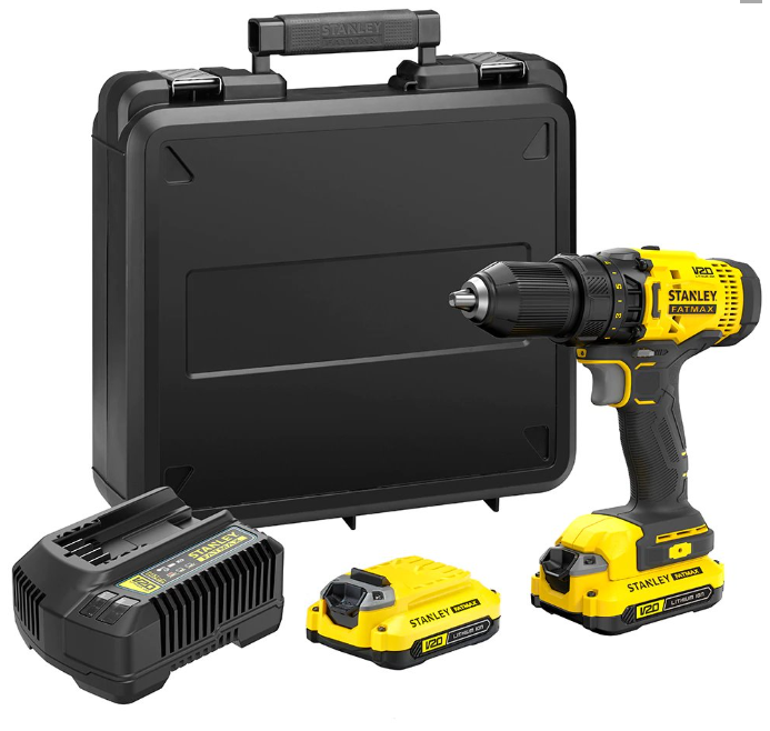 - Obsah balení: akumulátorová vrtačka STANLEY® FATMAX® V20 18 V, kufřík, 2 x 1,5 Ah lithiové baterie, 70min 1,25A nabíječka
