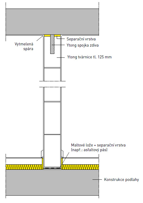 • Přesné zdění na tenké maltovélože tl. 1–3 mm.Zásadně dodržovat plnoplošné maltování celé ložné spáry. Pro nanášení malty používat výhradně přesné zubaté lžíce Ytong odpovídající šířky. Vystouplé zbytky malty neroztírat, ale tentýž den seškrábnout ostrou hranou zednické lžíce. U hladkých tvárnic se nanáší Ytong zdicí malta stejným způsobem i na svislou stěnu tvárnic (styčnou plochu). Pro založení 1. řady zdiva se používá Ytong zakládací malta tepelněizolační.